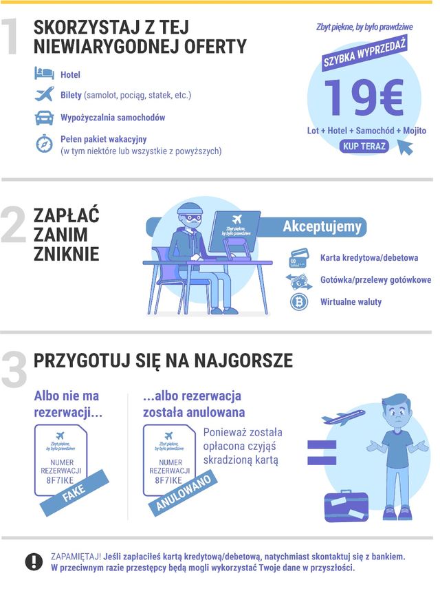Każdy cieszy się z wolnego czasu, a każda chwila w roku jest dobra na zasłużony urlop, zarówno krótki jak i długi. W większości przypadków szukanie wymarzonego kierunku podróży i znalezienie dobrej oferty będzie prawdziwą i bezproblemową transakcją. Jeśli jednak dokonujesz rezerwacji online, jesteś narażony na ryzyko oszustw i potencjalnych przekrętów. Ta strona pomoże Ci zrozumieć ryzyko i chronić swoje finanse oraz oczekiwania: