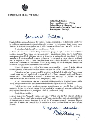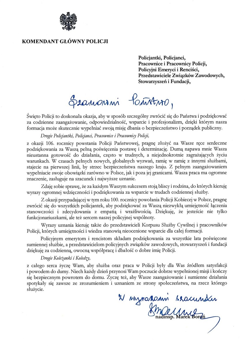 Z okazji Święta Policji Komendant Główny Policji nadinsp. Marek Boroń składa życzenia funkcjonariuszkom i funkcjonariuszom, pracownicom i pracownikom Policji, policyjnym emerytom i rencistom oraz przedstawicielom związków zawodowych, stowarzyszeń i fundacji.