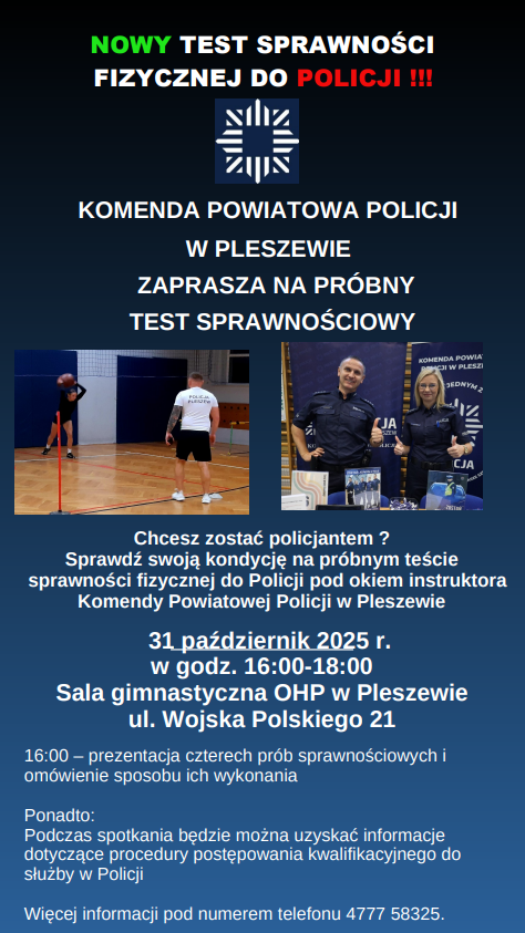 Pod okiem naszych policjantów dowiesz się, jak poprawnie wykonać test sprawności fizycznej, z jakich elementów się składa i jaki czas masz na jego pokonanie. Następnie każdy z Was będzie mógł się sprawdzić, wykonując poszczególne ćwiczenia.