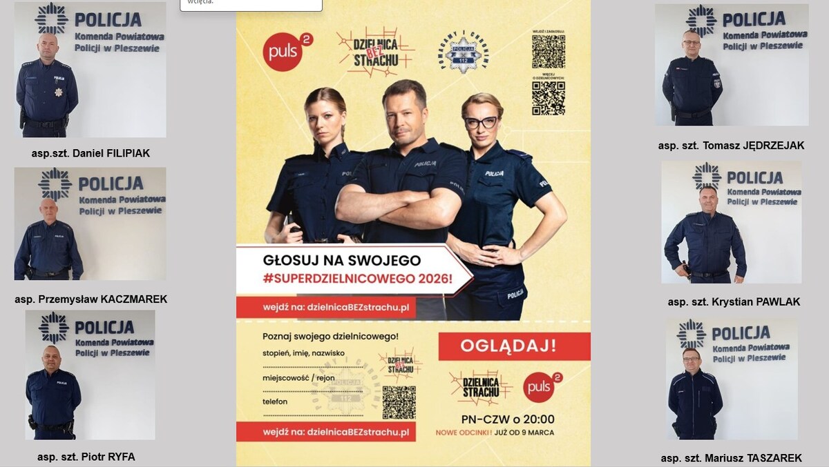 Jeszcze tylko do 16 kwietnia można oddawać głosy w plebiscycie #SuperDzielnicowy 2026 i walczyć o atrakcyjne nagrody. W bieżącym sezonie głosowanie trwa od 16 lutego do 16 kwietnia 2026 r. Komenda Główna Policji, Telewizja Puls oraz ekipa serialu kryminalnego „Dzielnica strachu” po raz czwarty wkroczyła do akcji i w ramach kampanii społecznej #DzielnicaBEZstrachu, prowadzą internetowy plebiscyt, którego celem jest promowanie bezpieczeństwa i współpracy lokalnych społeczności z dzielnicowymi oraz wyłoni